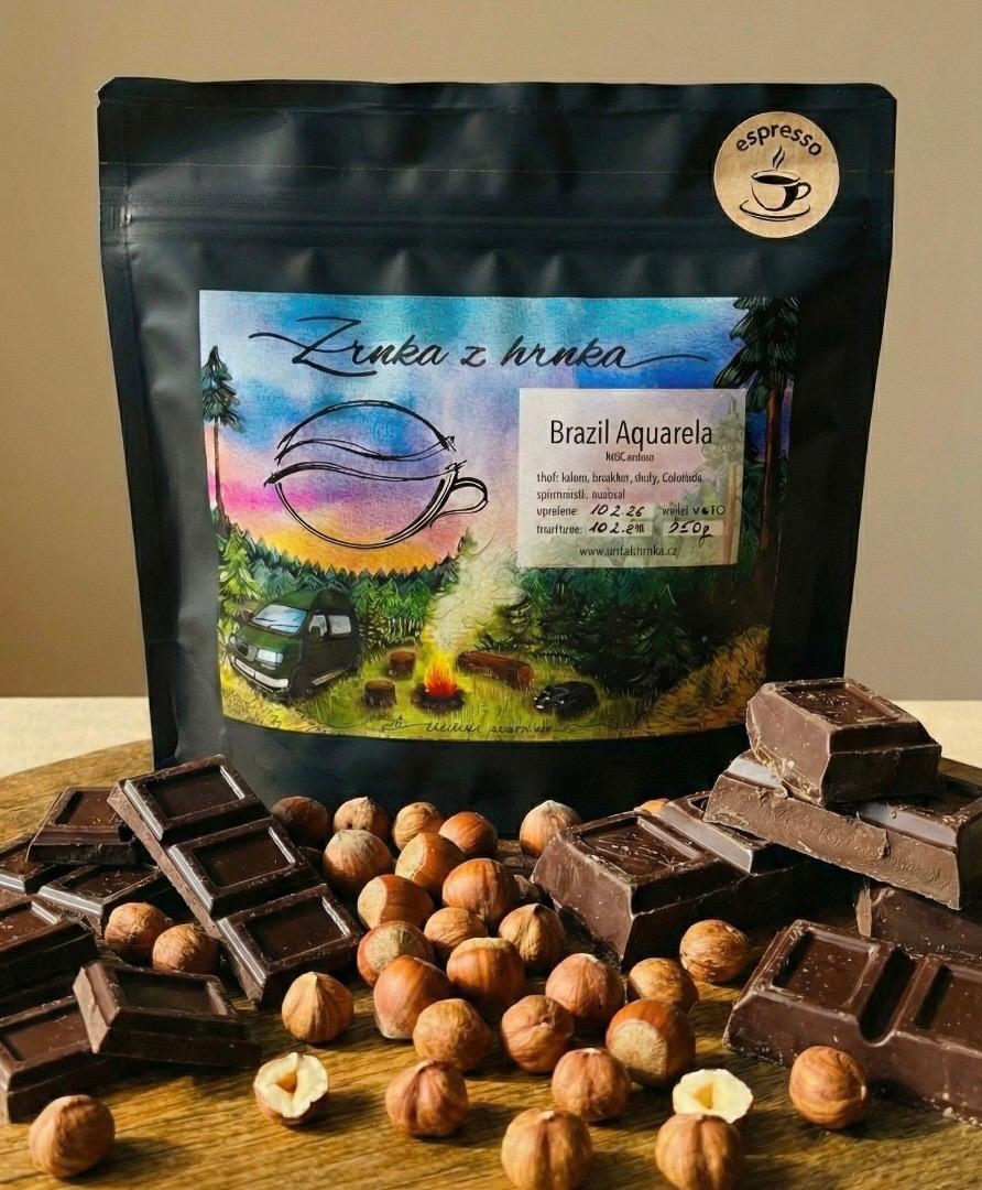Brazil Santos Aquarela NY2 je jemná 100% arabika s plným tělem a nízkou aciditou. Zaujme nasládlou chutí s tóny ořechů, tmavé čokolády a karamelu, doplněnou sametovou cremou. Skvělá volba pro milovníky vyváženého espressa i dalších příprav.
